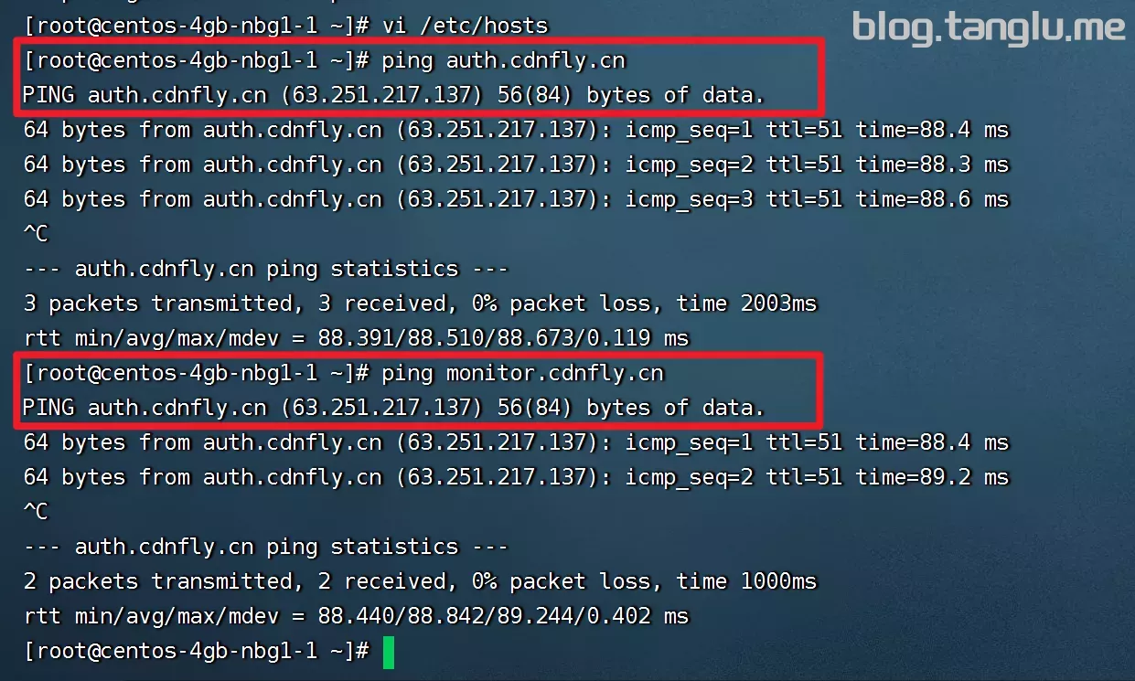 #如果都返回 51.81.222.246 说明hosts已经生效,主控vps请求 `auth.cdnfly.cn` `monitor.cdnfly.cn` 这两个网站的内容会直接去 `51.81.222.246` 这个服务器请求,这样就绕过了官方服务器的验证