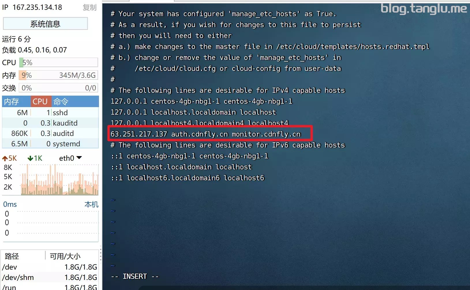 修改主控vps的hosts文件,将 auth.cdnfly.cn、monitor.cdnfly.cn 这2个域名指向刚才的自建云端服务器IP 63.251.217.137