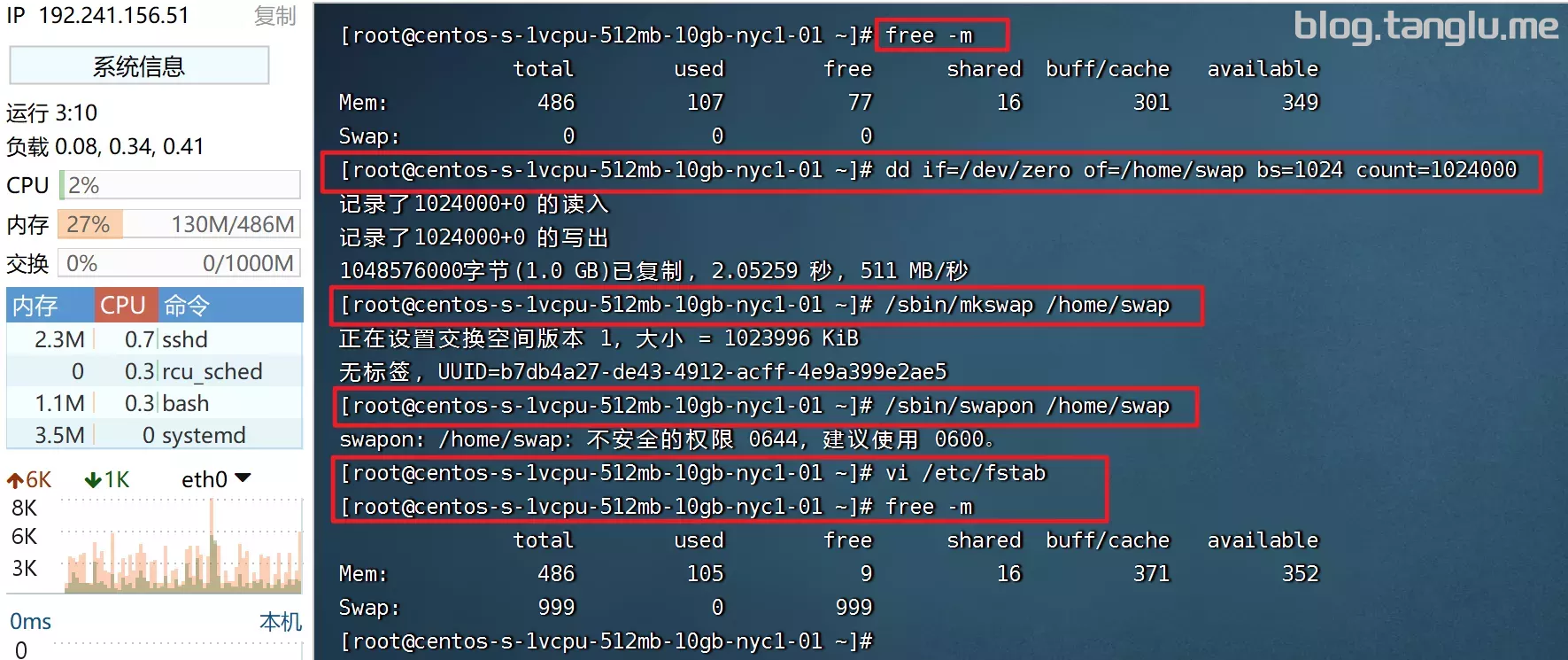 1GB内存及以下的小鸡必须添加SWAP否则会报错,2GB以上内存的vps可自行决定是否添加SWAP