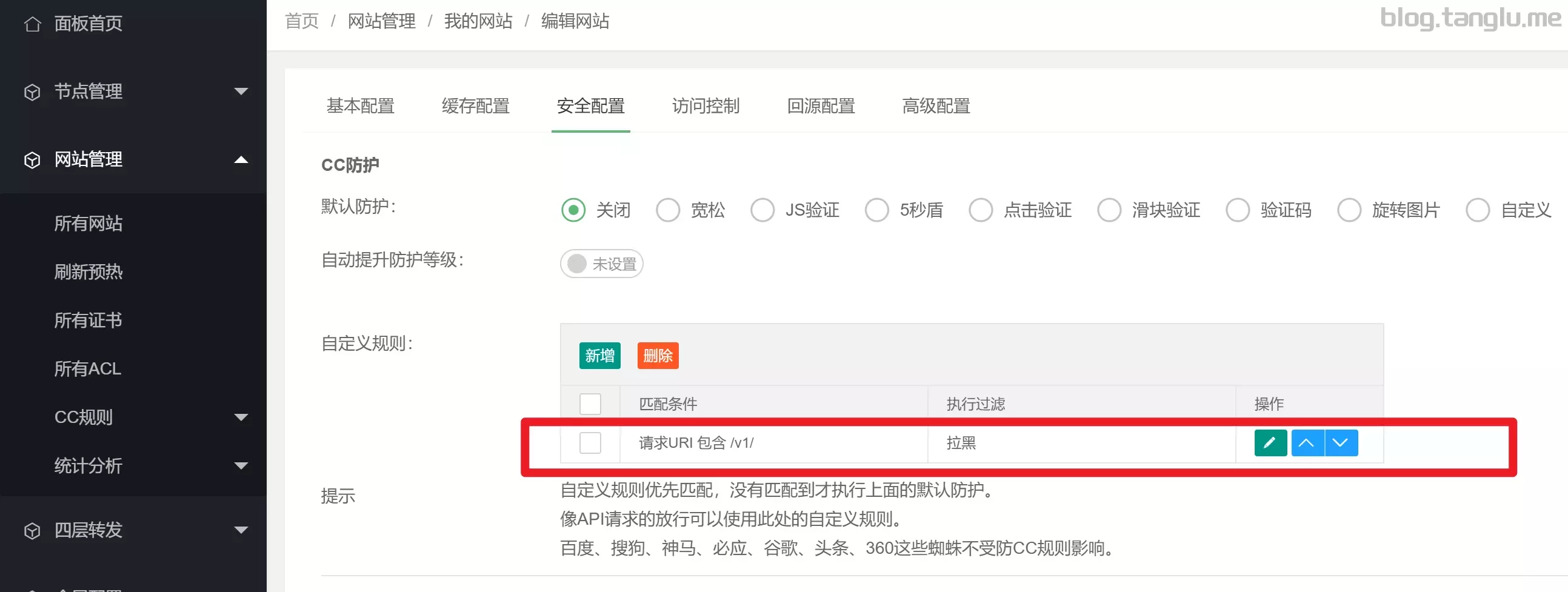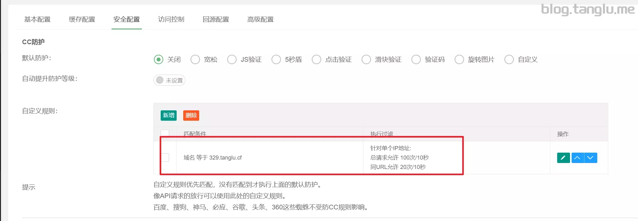 比如设置单IP 10s内最大访问 329.tanglu.cf 资源数为100,单个资源最大次数为20