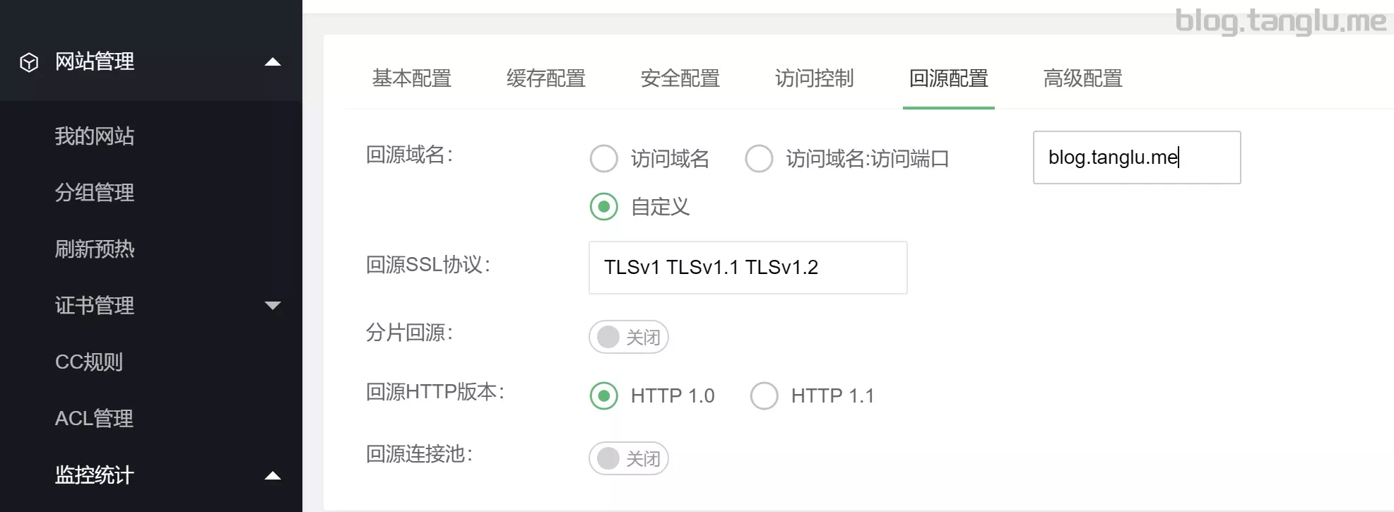 源站 blog.tanglu.me,现在用 blog.tang.lu 反代源站 ,如果直接给blog.tang.lu配置普通CDN CDN设置回源站点是 blog.tanglu.me,CDN解析出blog.tanglu.me的IP 2.2.2.2 然后发送http请求为 ‘’域名blog.tang.lu IP2.2.2.2’,因为源站点没有配置blog.tang.lu这个站点 访问就会报错。但是CDN设置指定回源HOST为blog.tanglu.me,CDN设置回源请求就是 ‘IP是2.2.2.2 回源域名是 blog.tanglu.me’,这样就可以成功访问了