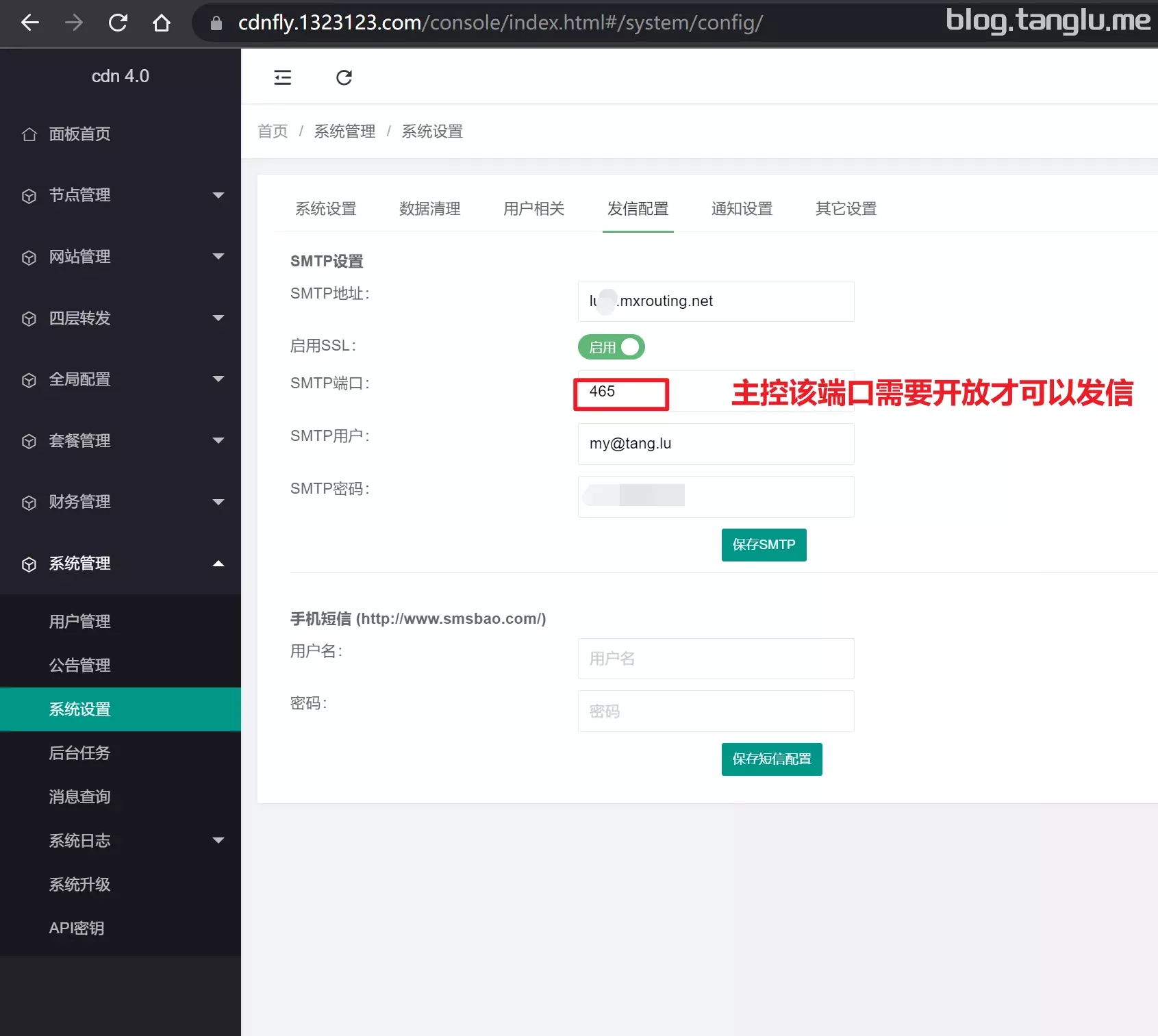 这里就是设置SMTP服务,QQ/gmail等都支持SMT发信,可以参考篇记录获取你QQ/gmail的SMTP专用密码:获取QQ/gmail等邮箱的SMTP账号密码