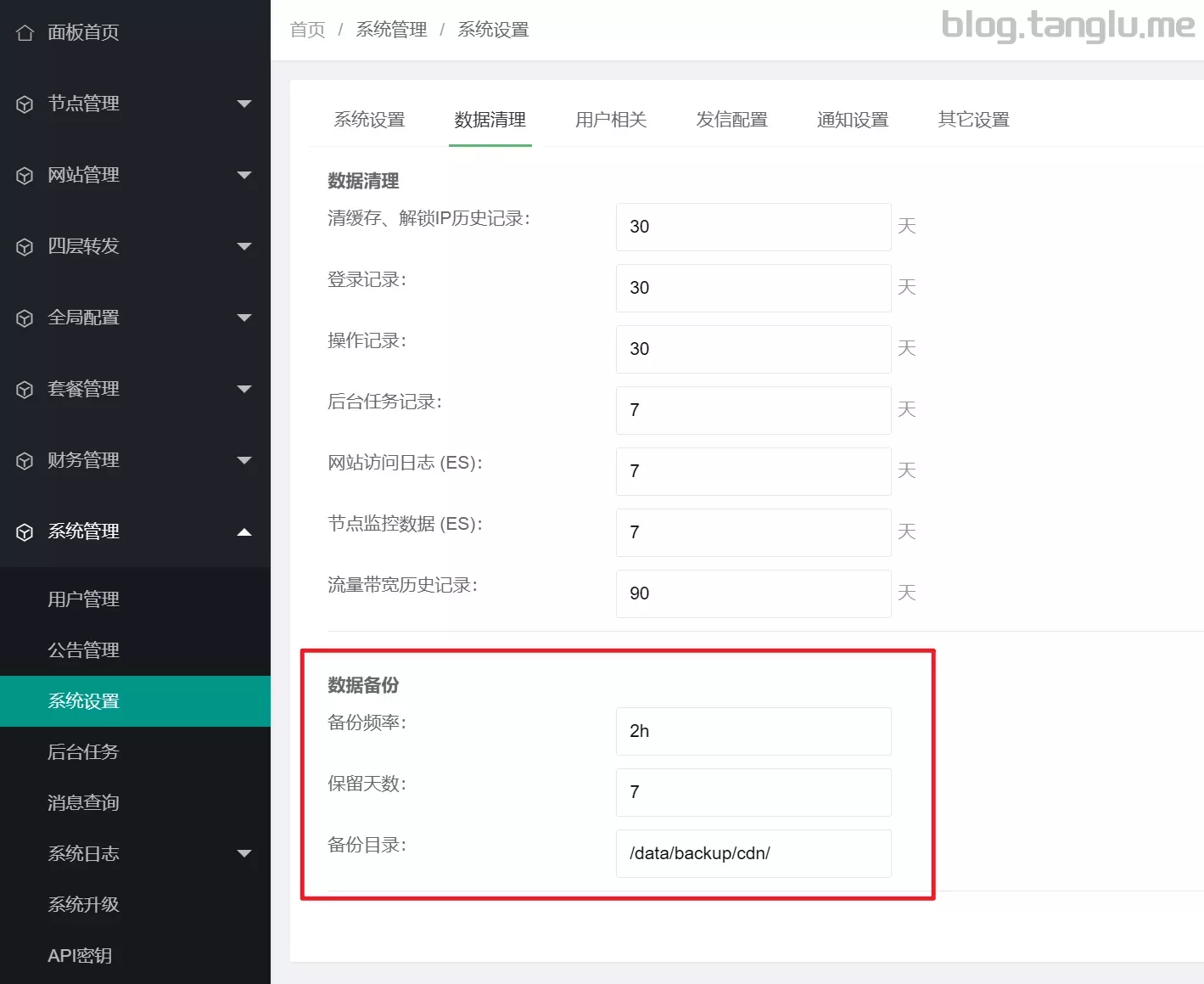 主控默认会每两小时备份数据库,备份默认保留7天(可以自行修改保留天数),备份文件在 /data/backup/cdn/